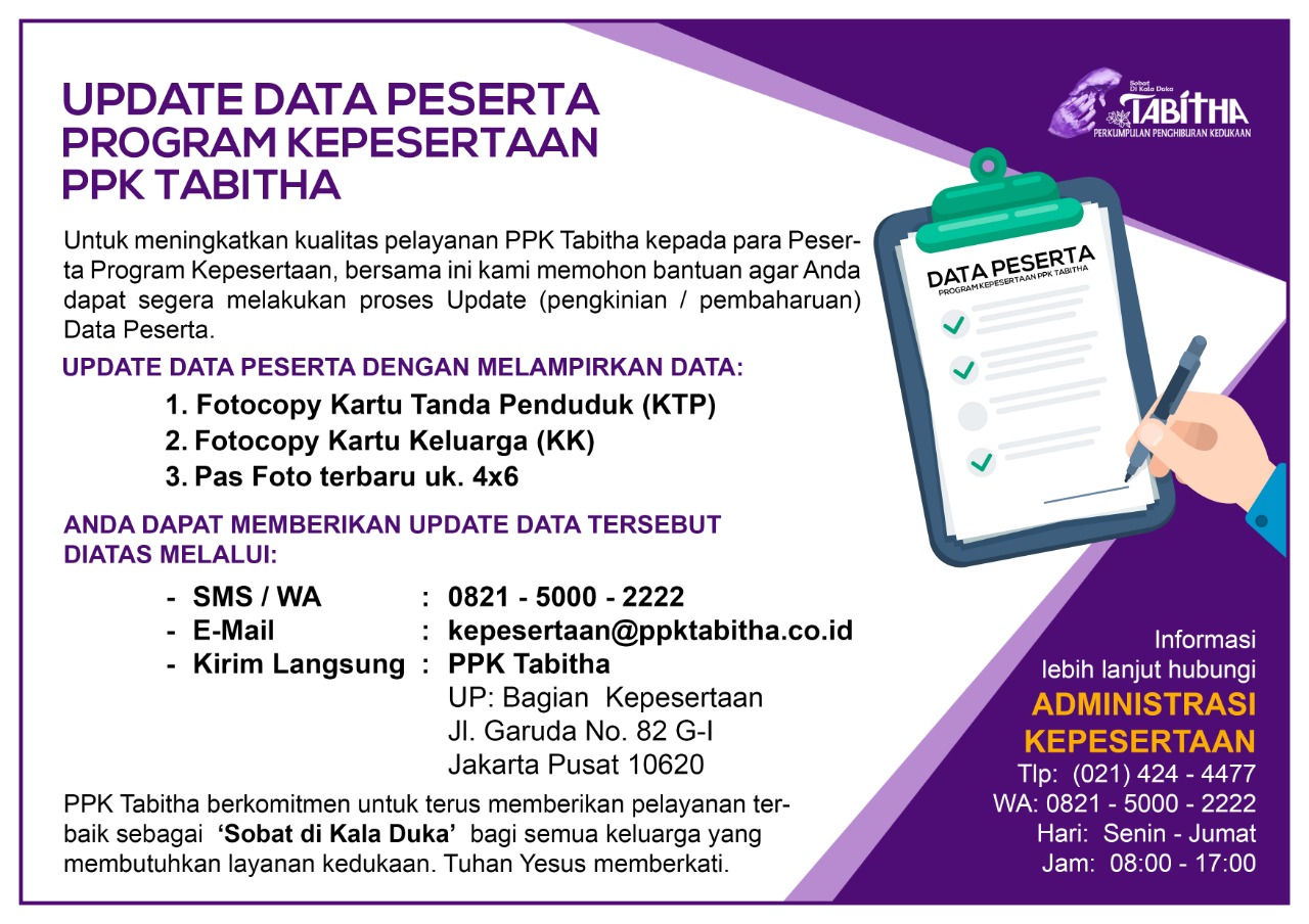 Untuk meningkatkan kualitas pelayanan PPK Tabitha kepada para Peserta Program Kepesertaan, bersama ini kami memohon bantuan agar Anda dapat segera melakukan proses Update (pengkinian / pembaharuan) Data Peserta.